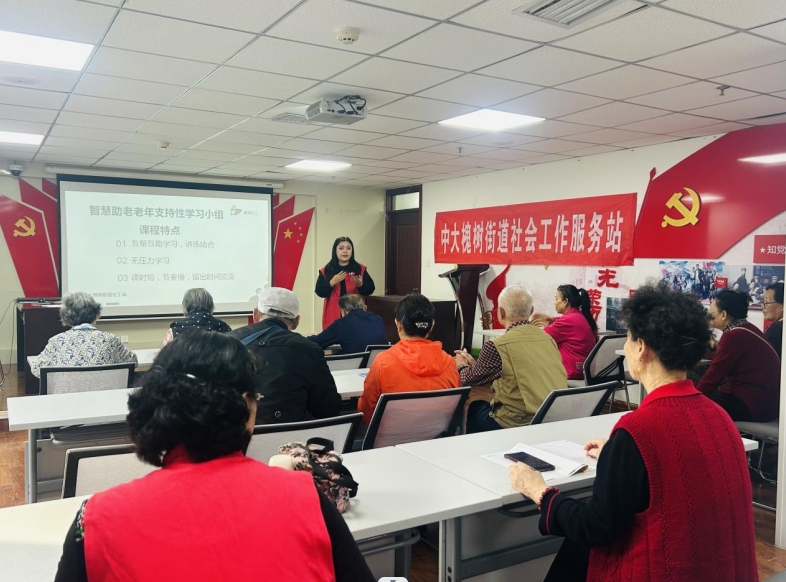 国务院办公厅《关于切实解决老年人运用智能技术困难的实施方案》中指出,要让广大老年人顺利搭上智能技术的快车,共享信息化发展成果。中大槐树街道社工站依据辖区老年人特点及需求,开展“掌握智能芯 社工伴长行”智慧助老老年支持性学习小组,搭建智能手机学习平台,协助老年人获取同辈群体的支持,强化老年人的社会支持网络,使老年人在智能化时代有更多的获得感、幸福感和安全感。