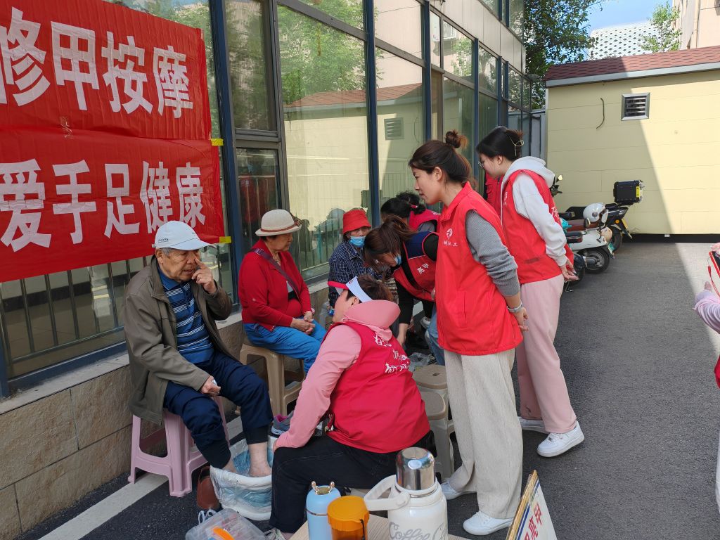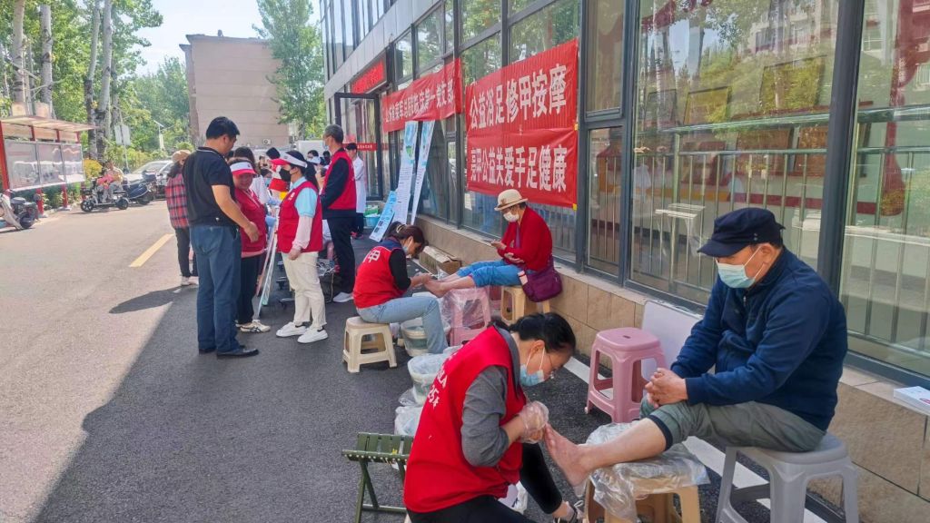 亮甲公益的工作人员们也在为居民服务,泡脚水做到一人一袋,工作人员也做到一人一手套以防止交叉感染。社工从中扮演“运输者”的工作,为居民的水盆里添加热水,以及更换新的泡脚袋。在泡脚之前工作人员会对居民的脚进行观察,在保证不感染的情况下进行泡药修脚,期间社工与居民交流互动并告知相关预防感染危害提高居民预防意识。现场居民表示:“我这灰指甲好几年了,我就不自觉得用接触了,结果我现在脸上也有一点,不好意思去医院啊,诊所也没去,得亏你们在社区搞这个公益活动我就赶紧来了,真不错,真不错”,社工同时表示会不定期开展公益活动,大家及时关注群内消息。