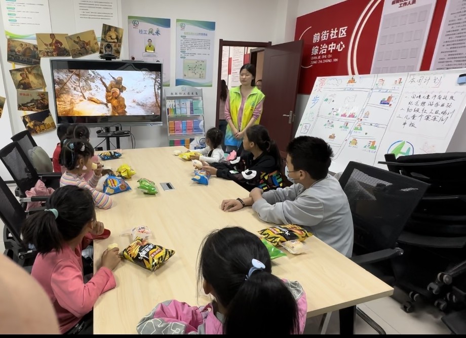为了让儿童认识到生命的意义,加强爱国主义教育,5月27日,崔寨街道社会工作服务站开展时光碎片生命教育小组“红色观影院”单元活动,社工与孩子们共同观看《长津湖》,一同走进战火纷飞的年代,体会幸福生活的来之不易。
