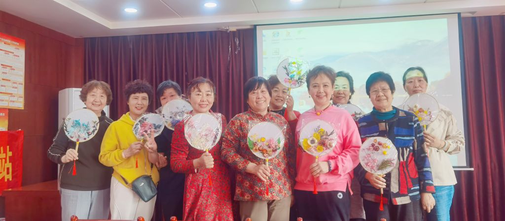 活动开始,社工先给阿姨们详细介绍了扇子的由来、扇子制作材料的变迁,以及扇面绘制的技巧等,并准备了团扇、干花包和酒精胶等绘制工具。阿姨们兴致勃勃地挑选了自己喜欢的干花包,拿起酒精胶小心翼翼地沿着扇面涂抹,在粘上自己喜欢的干花,有红色、粉色、黄色……大小不一的花朵,还可以配上绿色的叶子作点缀。不一会儿,纯白的扇面上便呈现了花团锦簇的美景。
