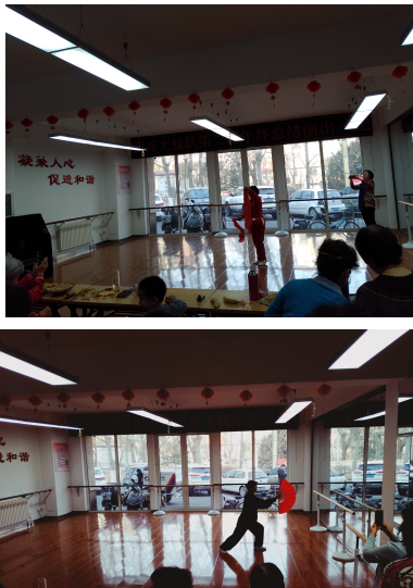 首先,社区党委书记对太极队一年以来参与社区活动的积极性提出了表扬同时对太极队下一年的发展提出了建设性意见。接下来是太极队汇报演出,其汇报演出以太极为主,以合唱、吕剧、腰鼓等为辅,表演形式多样,充分展现了社区老年人退休生活积极向上的精神面貌。