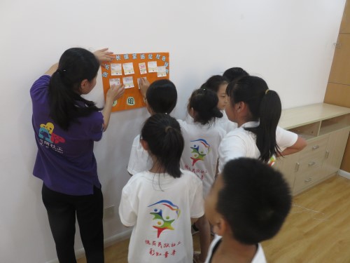 活动伊始,社工向前来参加活动的青少年介绍了“快乐成长课堂,追忆红色经典”活动内容与形式,激发他们对本期夏令营活动的期待。随后,社工通过“抢凳子”游戏,活跃了现场氛围的同时促进了青少年相互认识与熟悉。然后,社工与组员们共同讨论小组规范和契约,并引导组员书写出重要的自我要求和小组目标:“遵守课堂纪律”、“不讲脏话不打架”、“练好字”、“养成良好的学习习惯”等,一张张填满字的便利贴表达出组员们对个人以及小组的美好愿望。最后,社工以“今日事今日做”活动主题,开启了“快乐成长课堂,追忆红色经典”的第一堂课。