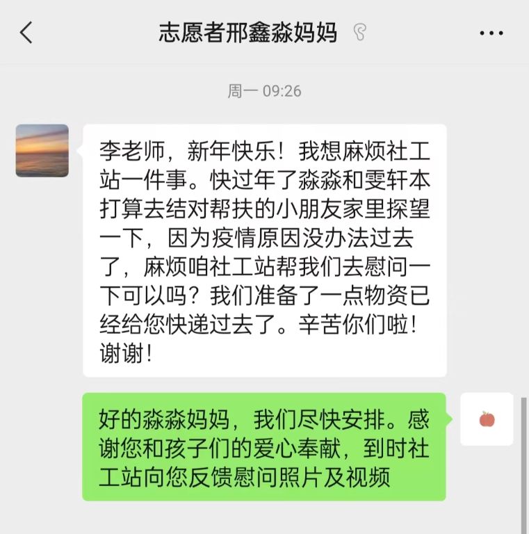 “叮叮”马山镇社工站收到一条温暖的微信新消息。临近过年,因辖区疫情形势严峻阻挡了两位志愿者小朋友探望哲哲的步伐。天气虽寒但爱心温暖,在志愿者的托付下,社工站带着生活、学习、防疫物资及承载着两位志愿者小朋友满满的关怀来到哲哲家。