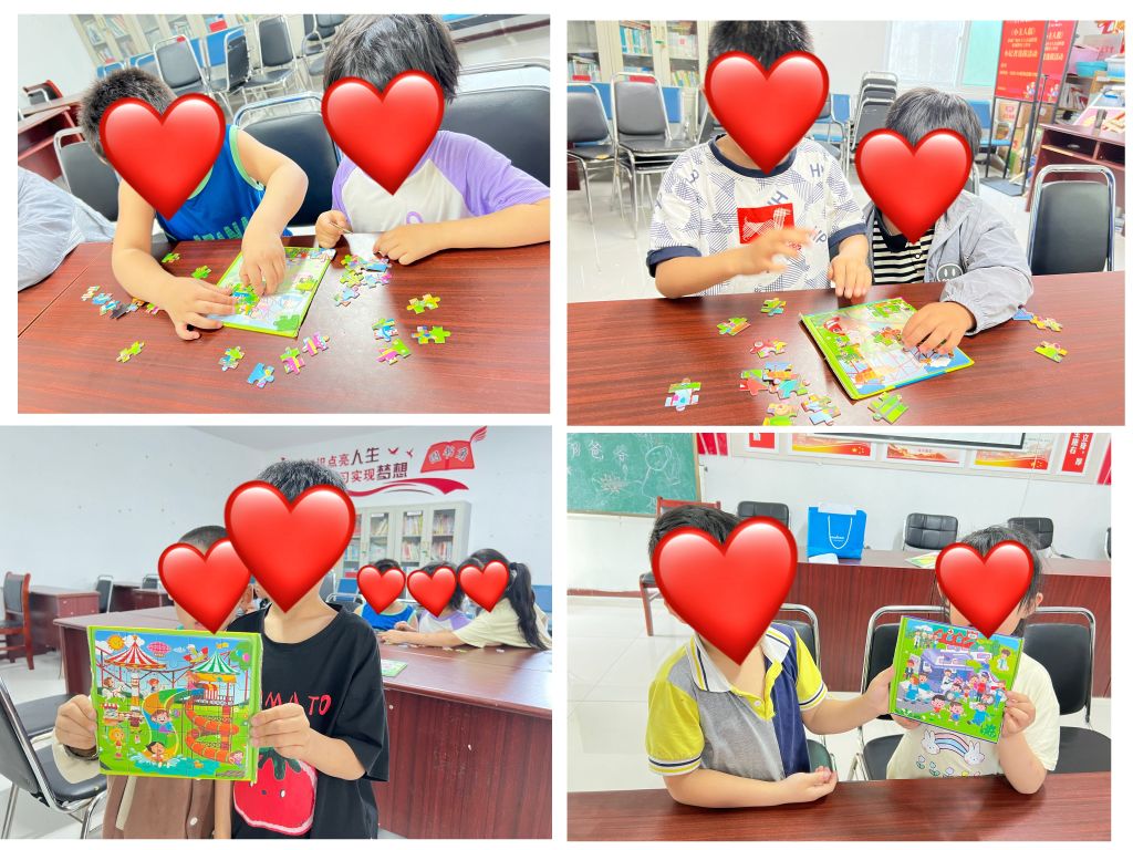 小组初期,社工扮演组织者和引导者的角色,鼓励组员依次进行简单的自我介绍,大部分组员略显拘谨。社工通过“破冰游戏”帮助大家进一步彼此认识,放松紧张的心情,游戏以孩子们喜闻乐见的“123木头人”使组员们逐渐投入其中,随着游戏的深入,大家渐渐展现出各种古灵精怪的动作,整个环节渐渐充斥起孩子们的欢声笑语。随后,社工带领组员进行拼图游戏,两两一组,过程中,从试探性的表达想法到慢慢的与伙伴交流,组员之间互帮互助共同完成拼图的那一刻,孩子们的脸上露出了开心的笑容。最后,驻站社工引导组员了解小组凝聚力及小组规则的重要性,并与大家共同制定小组契约。