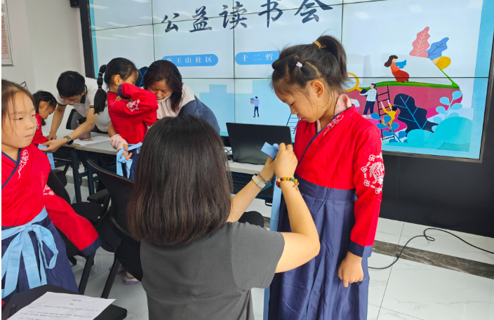 活动当天,小朋友带着对未知世界的好奇与渴望,早早来到活动现场。在国学老师及社工的引导下,孩子们开始了一场穿越时空的文化之旅,老师用生动有趣的语言,将古老的文字转化为一个个鲜活的故事,让孩子们在听故事中学习做人的道理,感受文化的博大精深。社工们还设计了互动环节,如知识问答、诗词接龙,角色扮演等更是将活动推向了高潮,让孩子们参与体验国学的乐趣,加深对国学知识的理解与记忆。