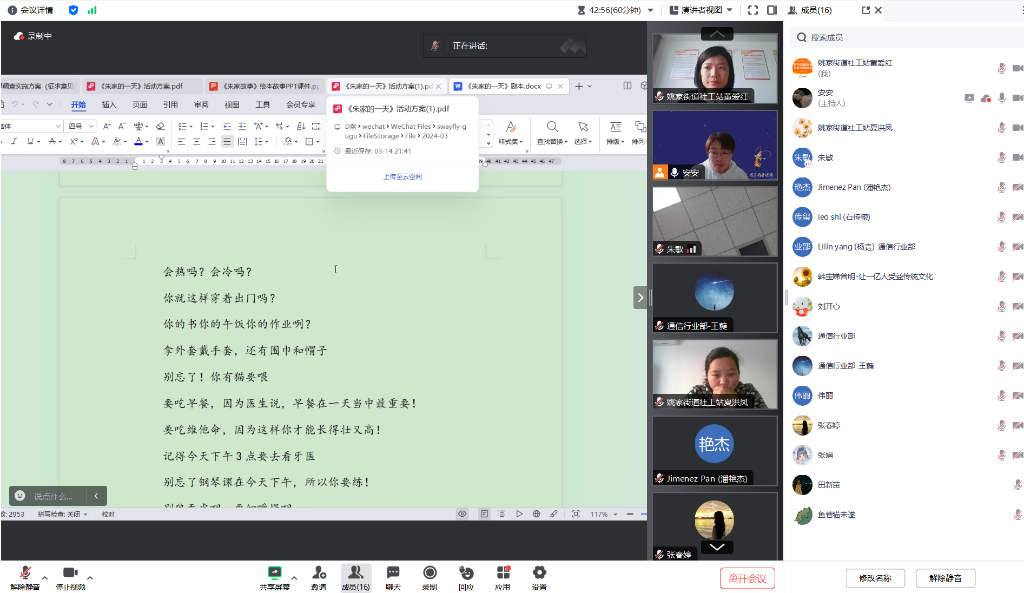 春风拂面,阳光明媚,3月15日,姚家街道社工站与华阳社区阅读剧场项目携手合作,共同举办了一场别开生面的线上志愿者培训会议。本次会议由社工站精心策划,并由阅读剧场项目负责人安慧进行线上培训,旨在提升志愿者的服务能力和素质,为社区阅读剧场项目的顺利开展打下坚实的基础。
