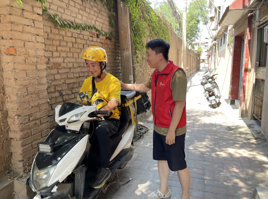 大柳行社区里的美食门店云集,大量的外卖小哥穿梭其中,他们为周边社区居民提供送餐服务。因为天气越热,周边社区居民的配餐需求越来越多,社工们趁空把水送给忙碌的小哥们,并嘱咐他们带好头盔、注意交通安全。