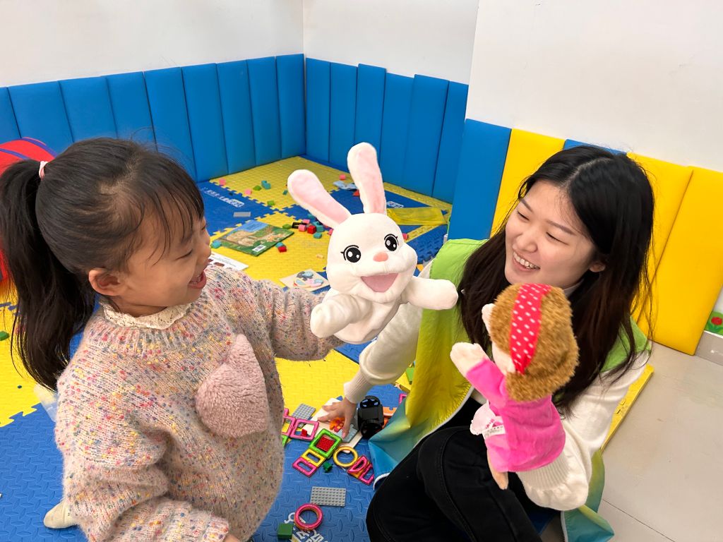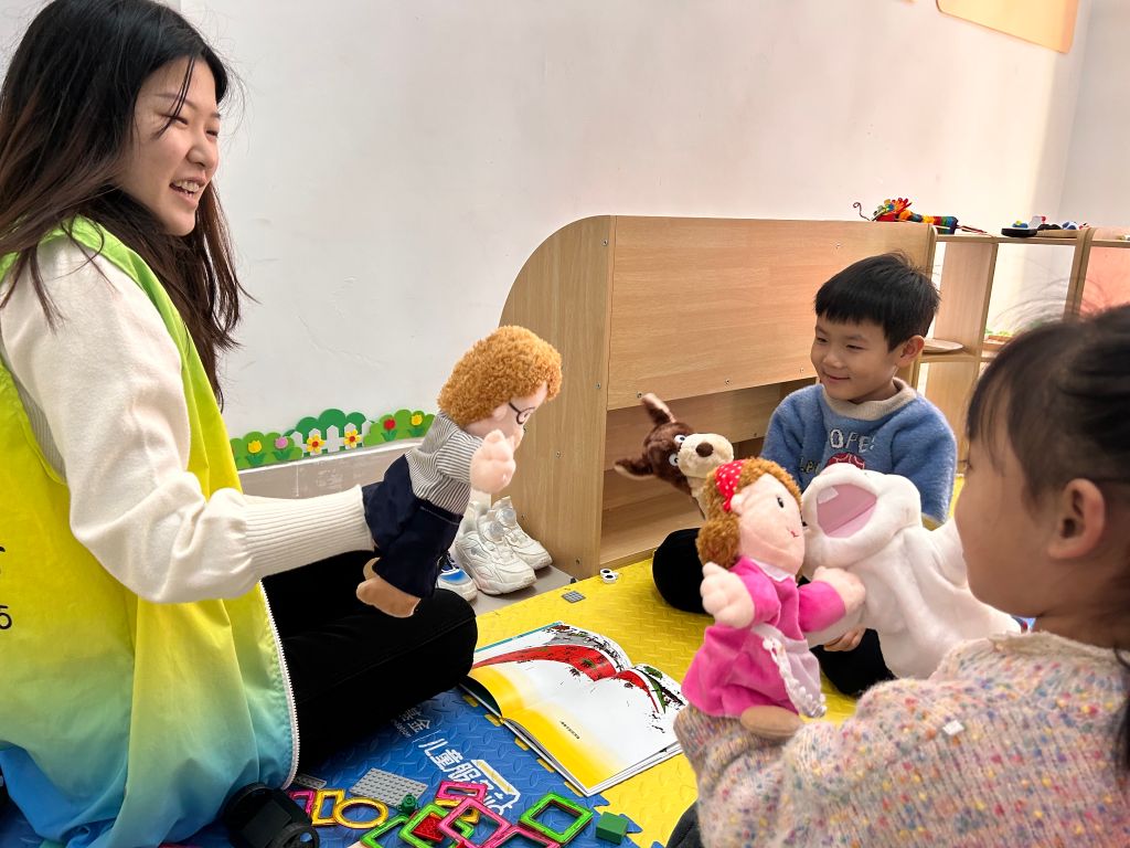 接着,社工鼓励孩子们与手偶进行互动,通过对话和表演来锻炼他们的表达能力。有的孩子问手偶:“你喜欢吃什么?”又扮作手偶回答:“我喜欢吃苹果和香蕉。”还有的孩子完全融入到手偶角色当中,与其他孩子的手偶进行互动,他们用手偶表达情感,讲述生活中的点滴趣事,甚至模拟日常对话,分享自己的快乐和烦恼,也倾听其他孩子的心声。在这个过程中,孩子们不仅锻炼了语言表达能力,还学会了如何运用手偶来丰富自己的表达内容。