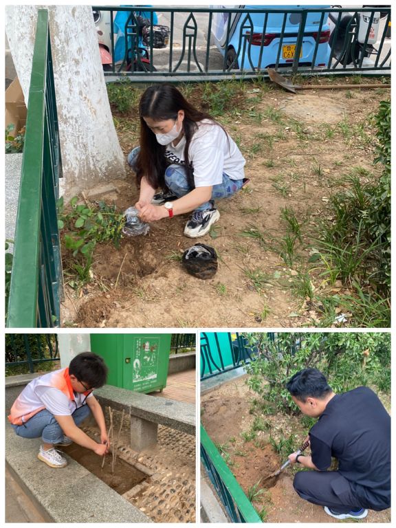 大家拿起工具,撸起袖子干劲十足。有种植经验的居委会工作人员引导居民和志愿者们如何挖土、栽种、平整,并耐心告知注意事项,大家积极动手,一起思考,一边行动,拿起铁锹将自己的美好想象变为现实。