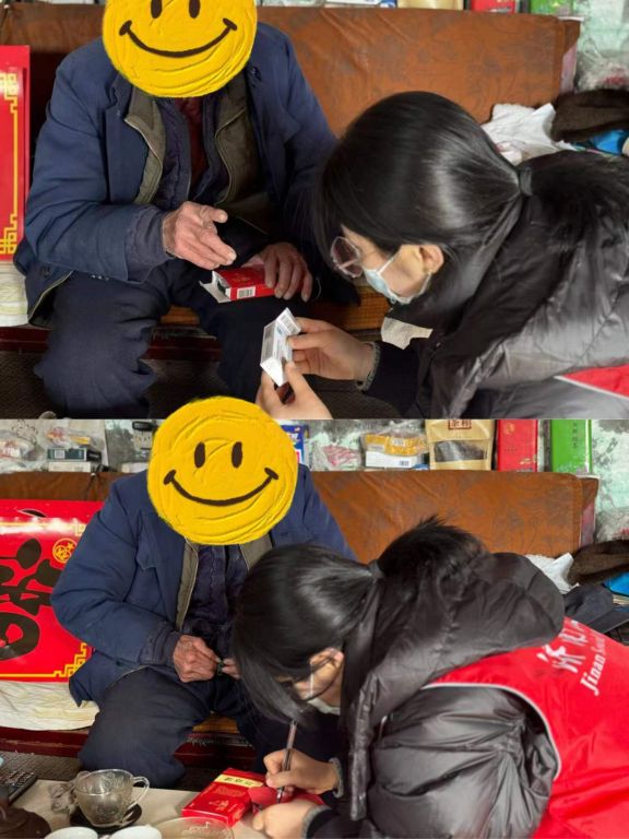 社工化身“安全使者”的身份,了解老年人的身体健康情况,是否患病、患病程度如何、如有疾病能否及时得到治疗、是否定期服药,尤其注意患有心脑血管疾病、呼吸系统疾病等慢性病的情况;了解老年人的居家环境安全情况,房屋是否危旧存在安全隐患、炉灶烟囱等取暖设施是否安全可靠、自来水有没有做防冻处理,特别是独居、空巢、留守等特殊困难老年人的安全保障情况。在检查药物时好多药物都过期了,社工叮嘱老年人过期的药物及时扔掉,不要乱吃药;还有位老爷爷,长期吃药,但有时会忘记吃药,在得知老人识字的前提下,社工用便利贴的方式为老人写清楚服药次数及时间,提醒老人及时吃药,临走的时候老人一直说着感谢的话。