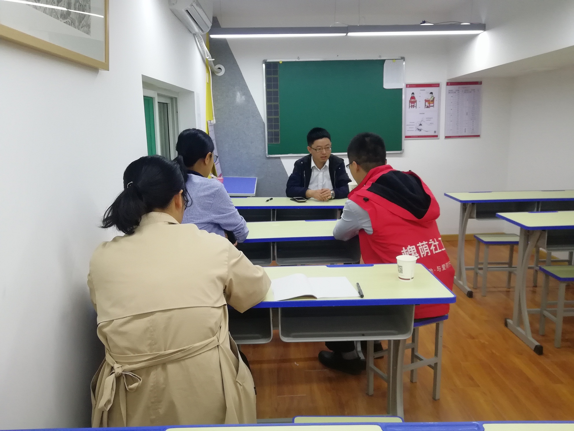 5月9日上午,新映象项目组带领山东建筑大学实习生吴梦恩、郑文娟拜访了项目组驻地单位诚励书画教育,就社区企业同创共建文明街区进行了交流。
