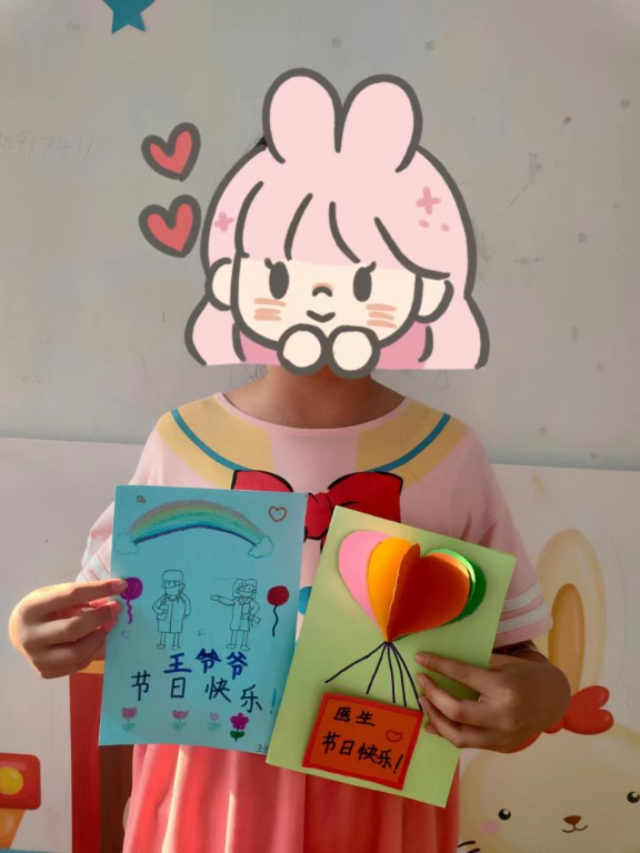 最后,孩子们在社工的带领下为科室的医生们制作了感谢贺卡,贺卡封面的热气球装载着患儿们对医生满满的爱,打开贺卡,里面是孩子们为医生画的充满爱的画图。孩子们将自己制作的贺卡送给医生,以此来表达自己对他们的感恩。