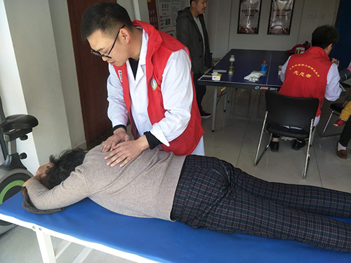 居民得到通知后早早来到现场,并主动向志愿者询问一些中医药保健知识,让志愿者帮忙查看自己的健康状况,在场的每一位志愿者都非常耐心的解答大家的疑惑,普及中医药知识。志愿者在为大家量血压的同时细心叮嘱平时注意事项,记得每天用药;把脉的志愿者帮居民分析身体健康状况,平时该怎样调整饮食习惯。有颈、肩、腰不好的居民,在这里也享受到了专业的推拿按摩治疗,一位阿姨在志愿者为其捏完颈椎后,愉快的说:“感觉一下子轻松了很多,他们的手法非常专业。”