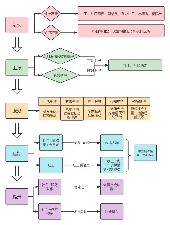 助人的终点不是解决问题,而是提高解决问题的能力。社工站基于此观点,社工站从“发现-上报-服务”延伸到“追踪-提升”阶段,特别是在当前社区网格化治理体系下,社工站对该体系进行优化,结合社区网格员仅止步于发现、上报服务对象的工作内容与特点,社工站将工作重点放在“服务-追踪-提升”上,不仅要解决当下问题,更要着眼于服务对象的长远发展。
