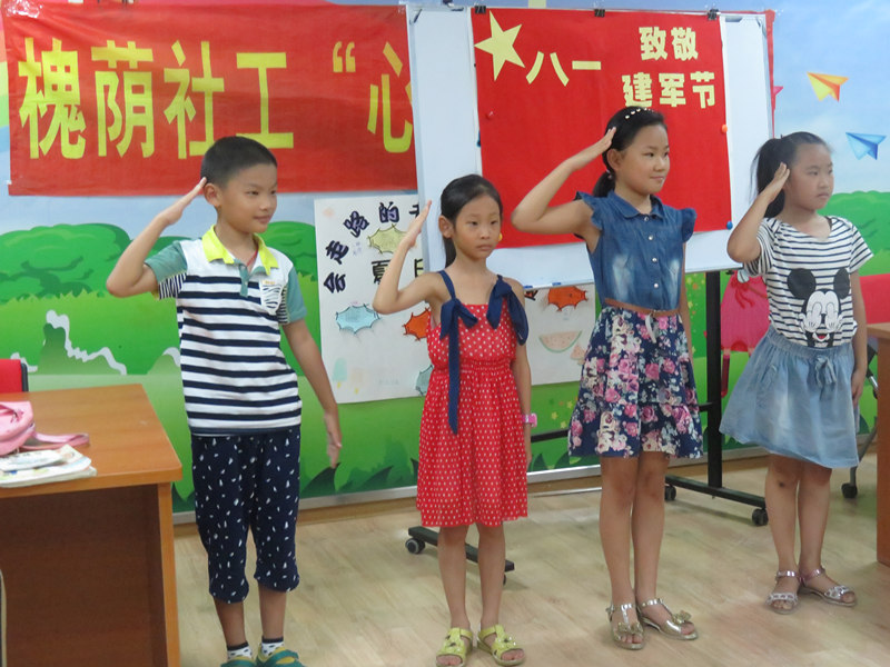 社工首先播放了庆祝中国人民解放军建军90周年阅兵视频,演兵场上整齐列队的护旗方队、地面作战群、人员方阵、军事化装备等让夏令营的孩子们激动不已;随后,社工就视频内容向孩子们提出问题,每个孩子都认真回答提出个人见解,并且积极演练敬礼动作;最后,孩子们一个个化身“军队小信使”,来到户外进行外展宣传,对过往行人普及建军节相关知识,行庄严军礼,以此向建军节致敬。