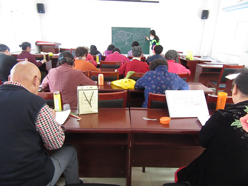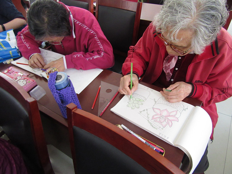 社工和志愿者首先引导老人签到并给作业评分盖章。在课上,志愿者介绍了今天的绘画内容,然后说明了画面结构和比例,引导大家先画出大概的轮廓,再一步一步细化。老年人们都非常积极的向志愿者们询问,学员们在志愿者的指导下逐渐丰满自己的作品,用签字笔勾勒轮廓,再上色,使得画面更清晰。经过一个多小时的创作,每位成员都完成了了自己满意的作品。