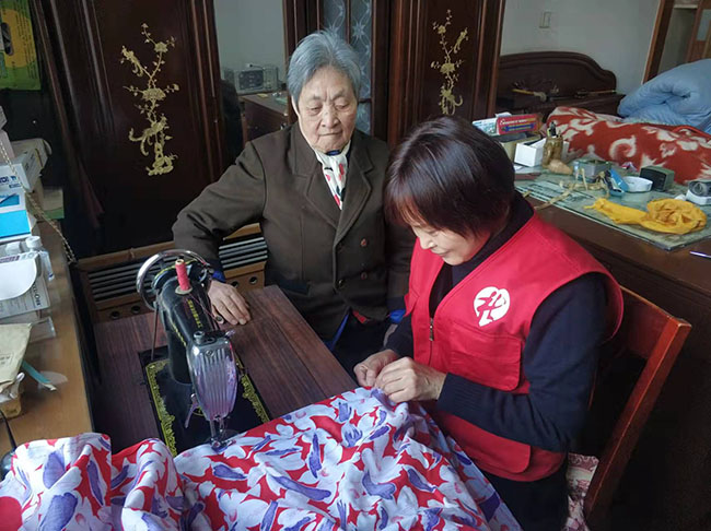 12月30日,天气比较寒冷,社工再次探访两位老人,我们的到来老人非常高兴,拉着我们的手,亲切的称呼我们闺女。访谈中问及老人需求时,老人说:“我正好有件事,正急的团团转呢,年纪大了,眼睛看不见了,家里需要缝制个被罩,腿脚不便不能出远门,自己想在家里缝被罩,没成想弄得一塌糊涂”“王老师不着急,我们社工来帮您”。