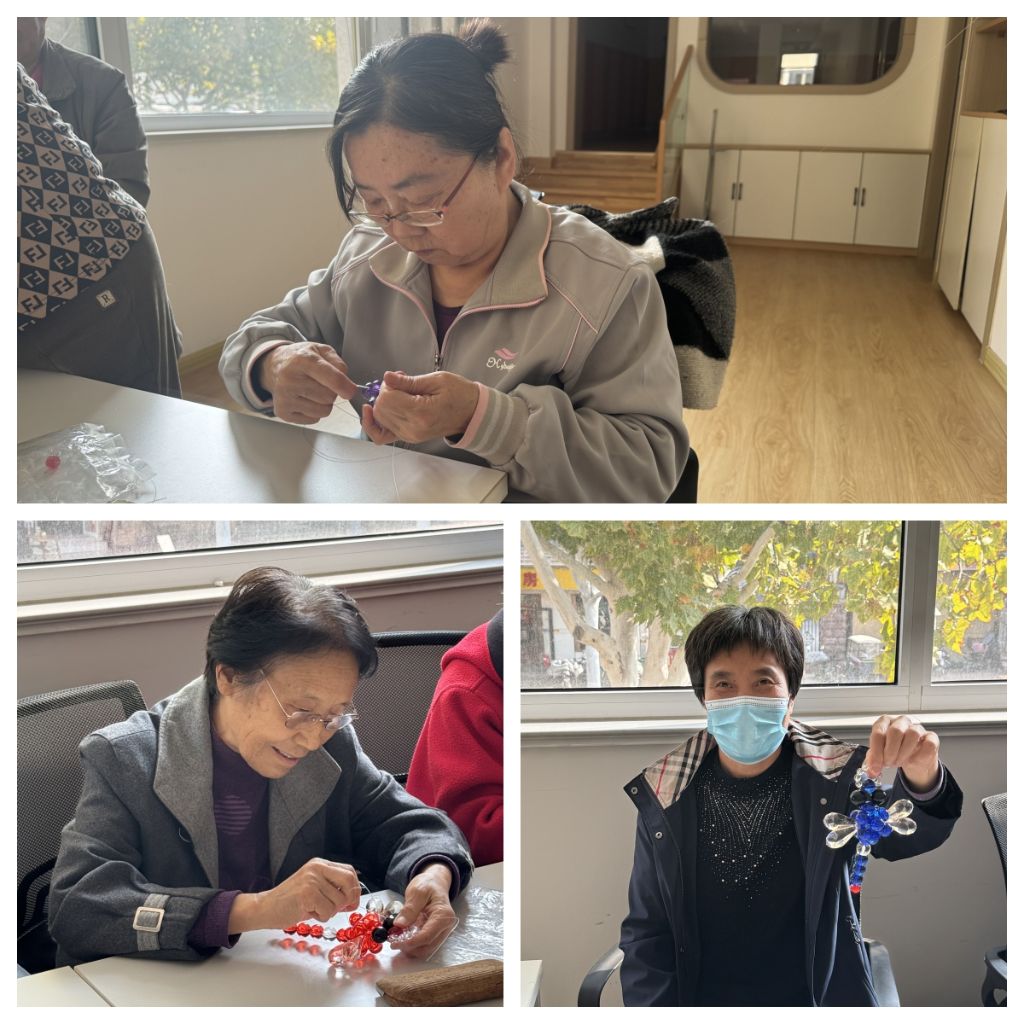 活动中,周老师为大家耐心讲解手工串珠的具体制作步骤和细节,选珠子、引线、串珠、打结……在老师的细心讲解下,原本看似复杂的串珠蜻蜓小摆件制作变得简单有趣起来。大家围坐在一起,全神贯注地跟着老师的步骤,挑选着五颜六色的珠子,用丝线精心地串联。社工则在带头人中间来回穿梭,对于没听懂的或者没学会的阿姨给予耐心解疑答惑,示范制作步骤。