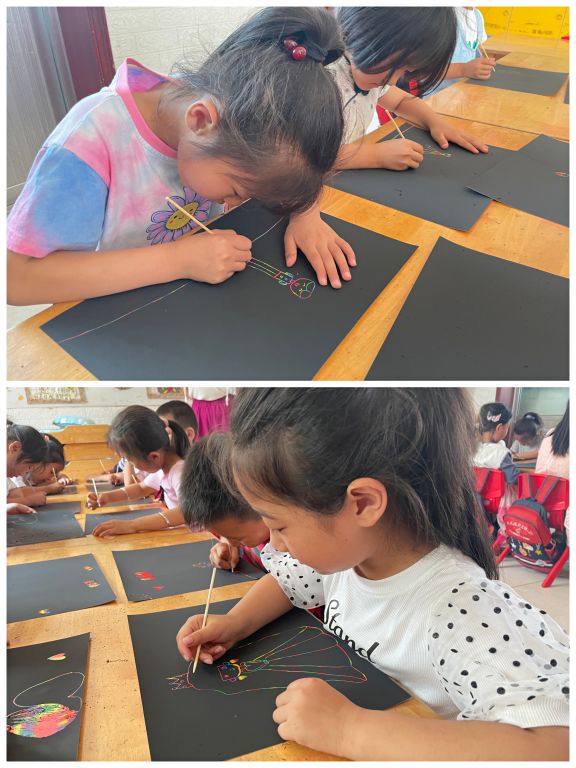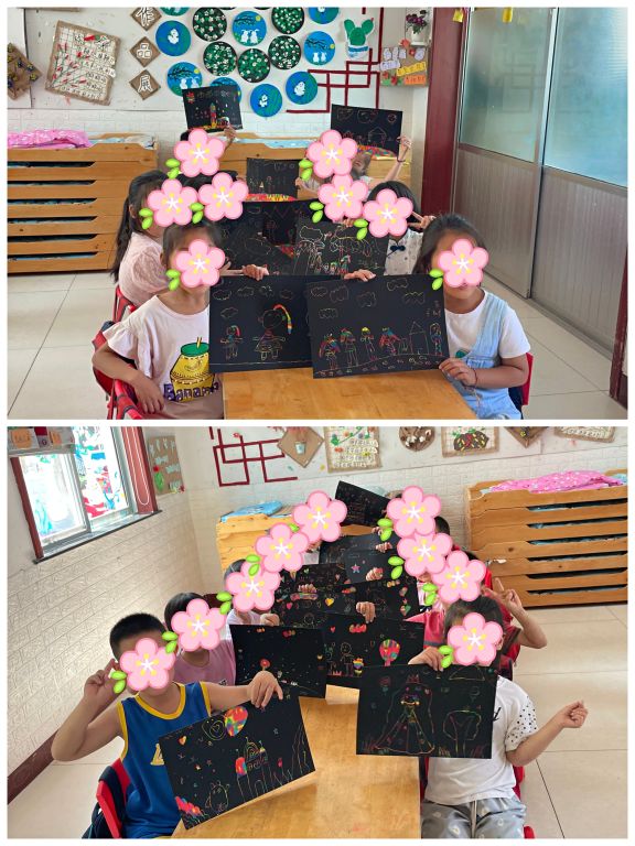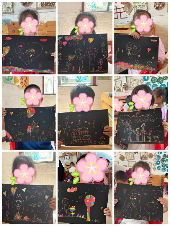 本次活动中,以父爱为主题展开艺术创作,通过前几节活动了解到的父亲节文化背景,运用刮画的方式制作出父亲的样子。