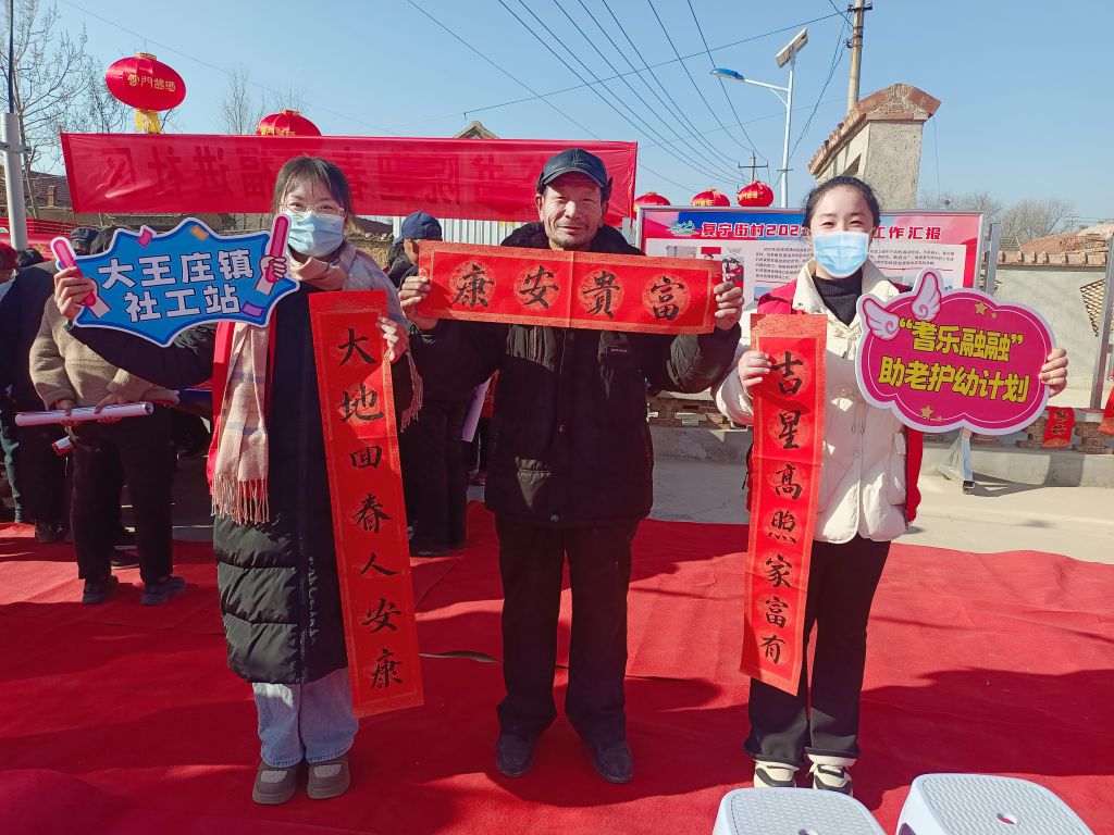 2024年伊始,为弘扬优秀传统文化,丰富辖区留守老年人的精神文化生活,营造浓厚的“老有所乐,老有所为”的文化氛围。1月5日,大王庄镇社工站协同复宁街村村委邀请山东金来集团链接山谷书院、山东艺术设计职业学院美术学院志愿服务队、龙山艺术团共同开展“‘莱’大王过大年,‘耆乐融融’赶大集”活动,大家齐聚一堂,写春联送福字,欢庆龙年新春。